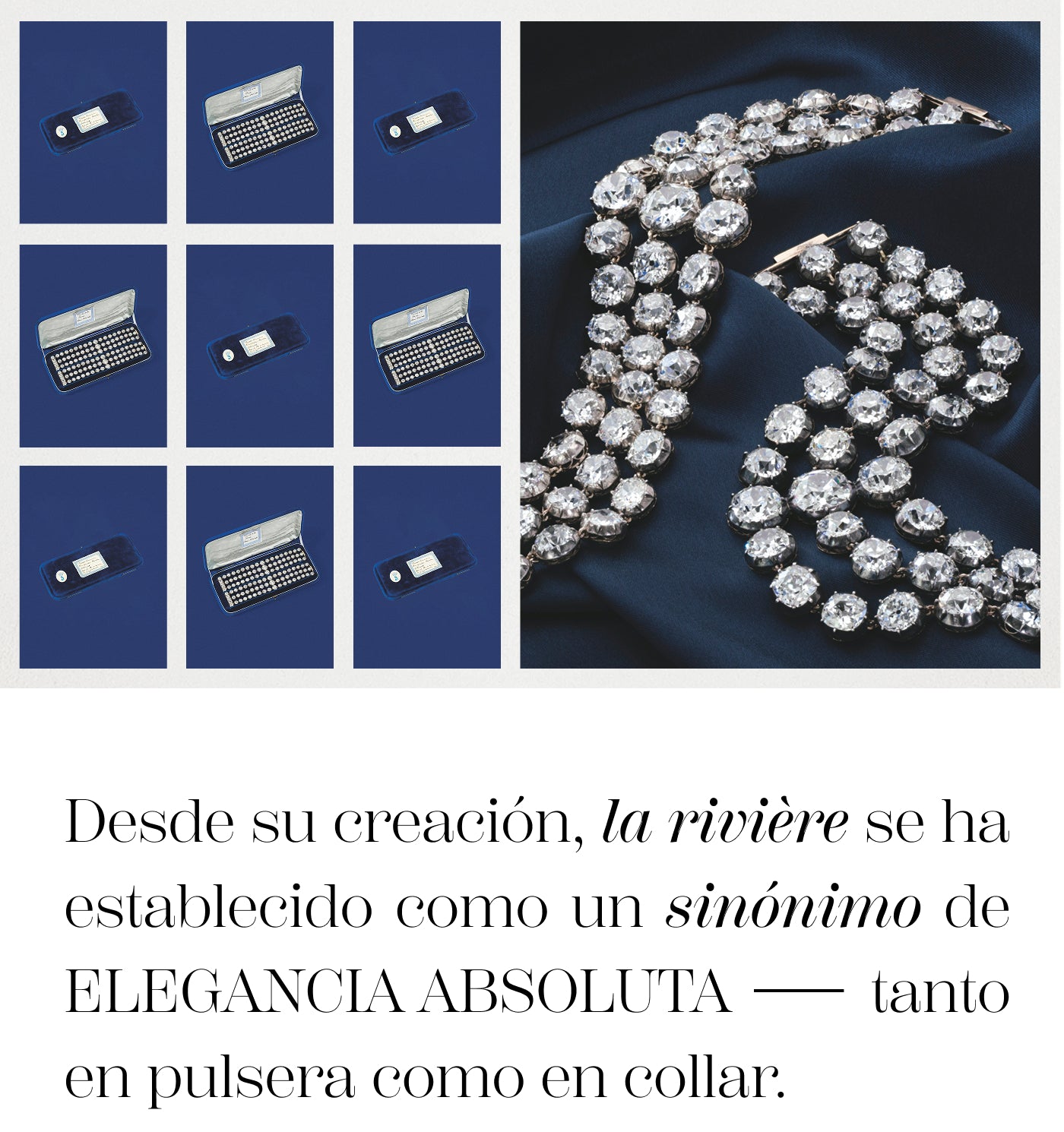 Desde su creación, la rivière se ha ido estableciendo como sinónimo de elegancia absoluta tanto en pulsera como en collar. Un icono que ha vivido distintos momentos de esplendor: desde la corte francesa del XVIII, cuando se convirtió en pieza indispensable entre la nobleza; pasando por los años 20, cuando dialogaba con el espíritu del Art Déco; hasta los 70, cuando volvió a situarse en el centro de la escena como icono imprescindible del lujo atemporal.