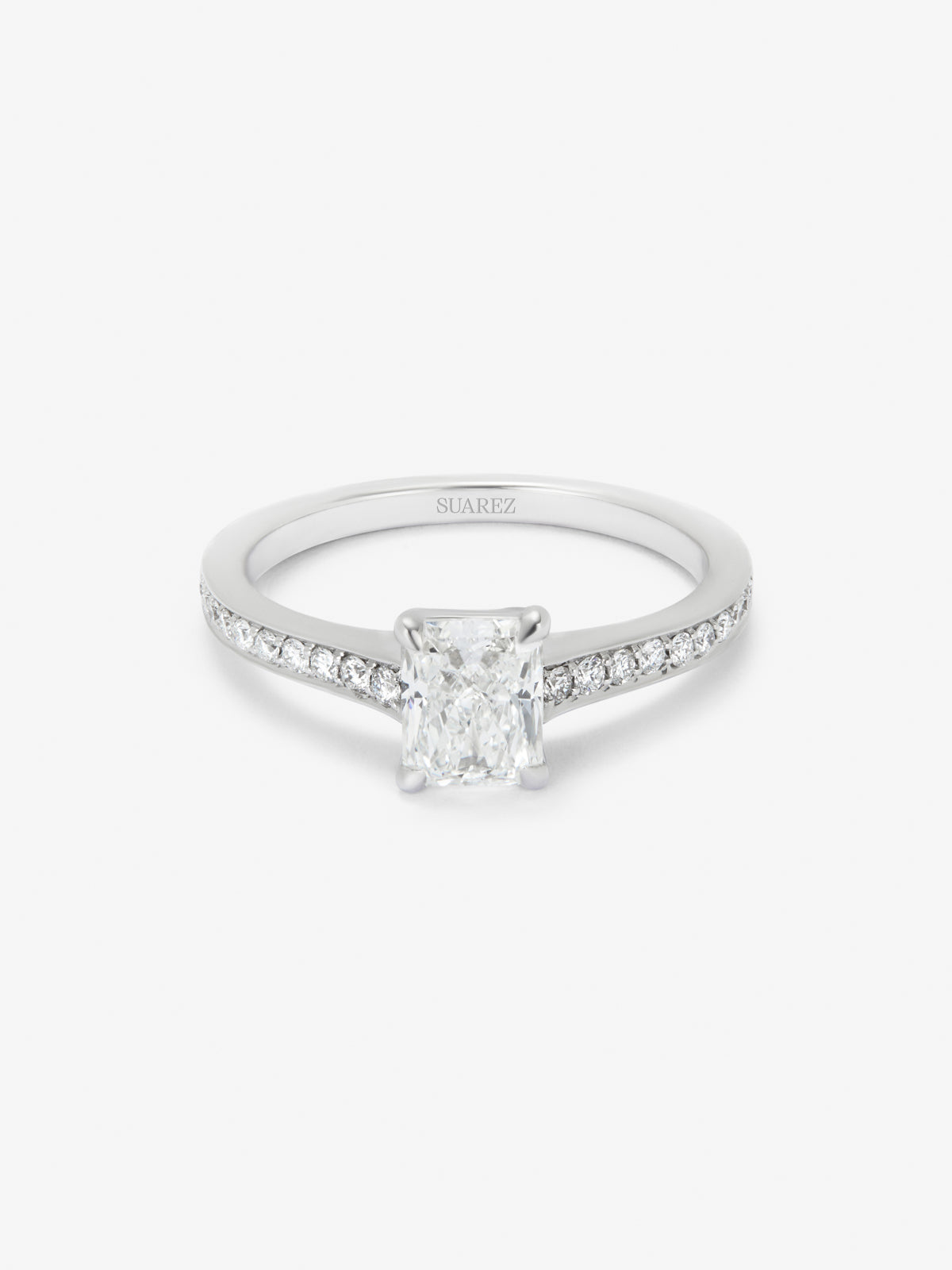 Anillo solitario de oro blanco de 18K con diamante central en talla radiante de 1 cts y 26 diamantes en talla brillante con un total de 0,16 cts