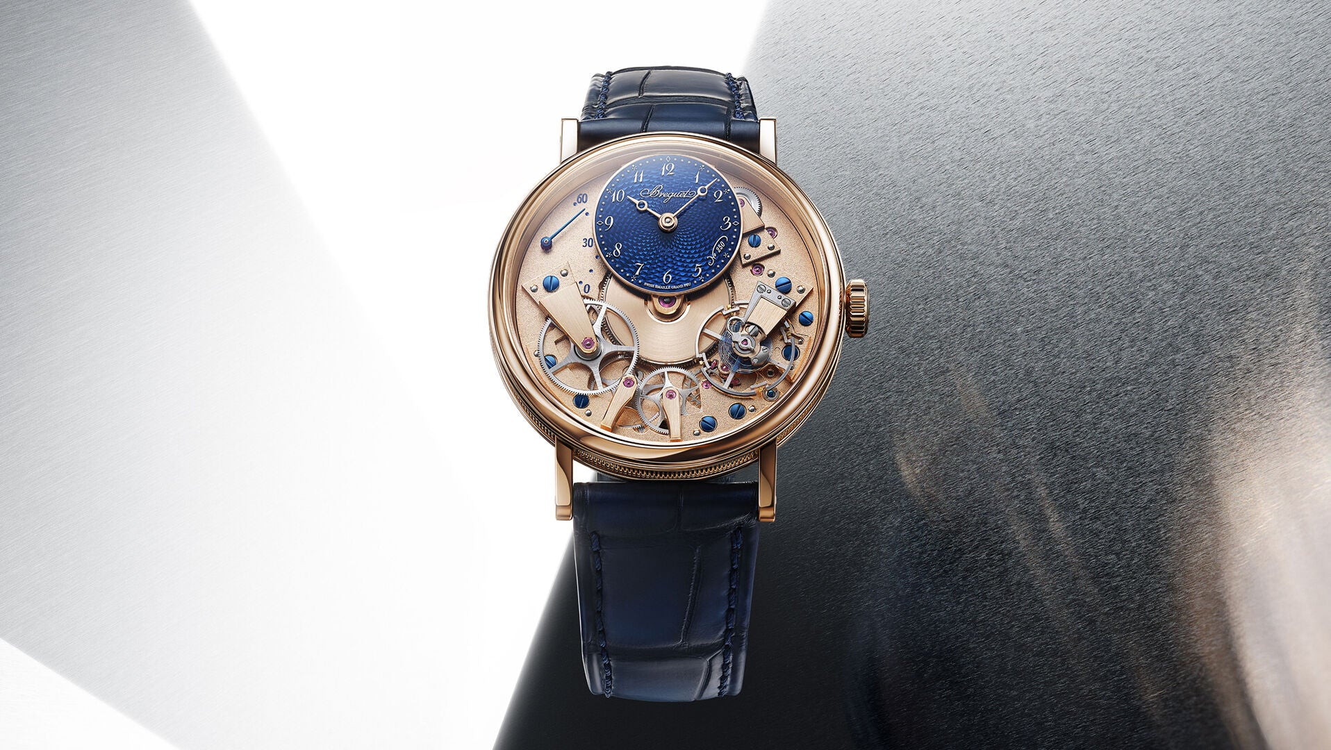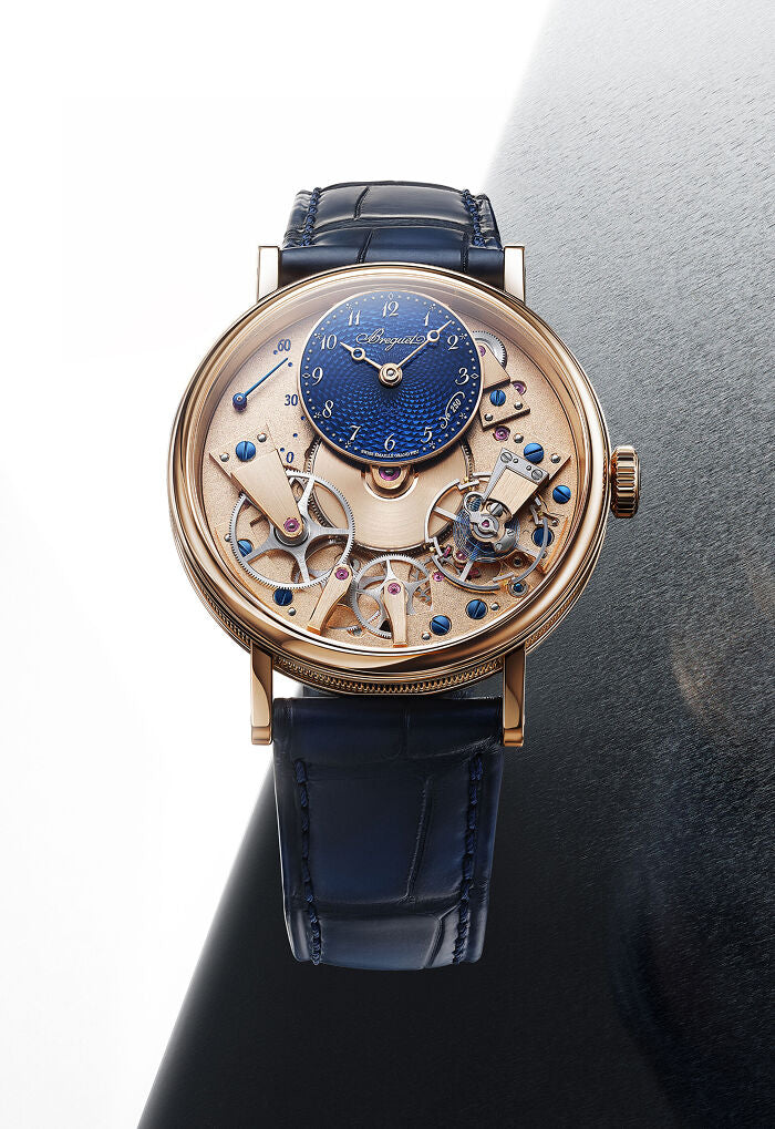 With meticulous finishes, this exclusive model combines the house's two emblematic color codes: gold and Breguet blue. Paired with a navy blue alligator strap and presented in a commemorative box inspired by 18th-century Moroccan leather chests, this watch becomes a true time capsule celebrating two and a half centuries of watchmaking genius.