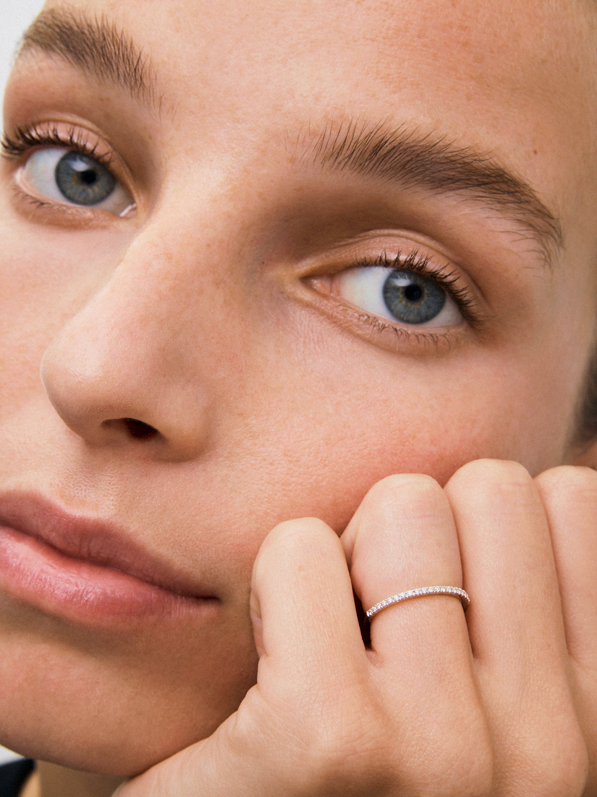 Una hilera de diamantes en talla brillante recorre esta luminosa media alianza de oro blanco de la colección Compromiso. Disfrute de una joya única, atemporal y para siempre. Esta joya ha sido elaborada utilizando los más selectos materiales, a partir de un cuidado diseño y la mano de obra de nuestros maestros joyeros. Esto convierte la pieza en una obra de artesanía completamente única.
