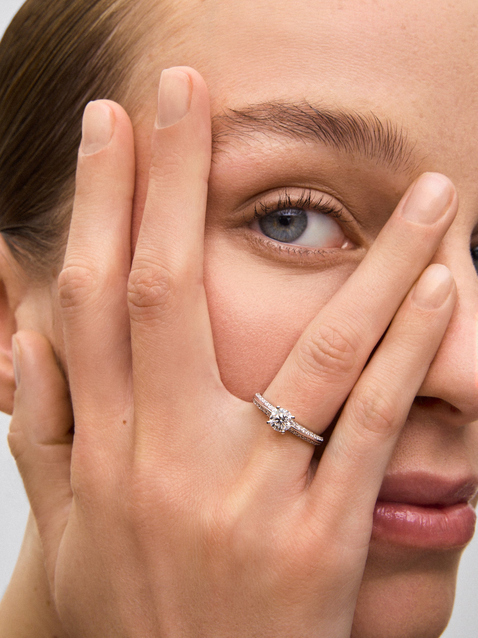 Solitaire ring in 18K white gold with a 0.70-carat central diamond and additional brilliant-cut diamonds totaling 0.22 cts